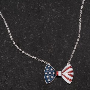 Red white and blue enamel form the bowtie for this cute and playful necklace. Cubic zirconia decorates the stars and the effect is a flag-themed bow tie thats fit to wear to delight everyone who sees it. The metal is rhodium plated and thats the same metal used to make white gold shine. When you wear this youre certain to draw attention and certain to have fun.
