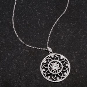 This pendant immediately draws the eye doesnt it? There are ten circles arranged with dazzling cubic zirconia and shiny rhodium plating for a geometric design that is sure to get a double take or two. Wear this the next time you are out and watch the conversations come your way.