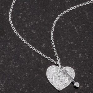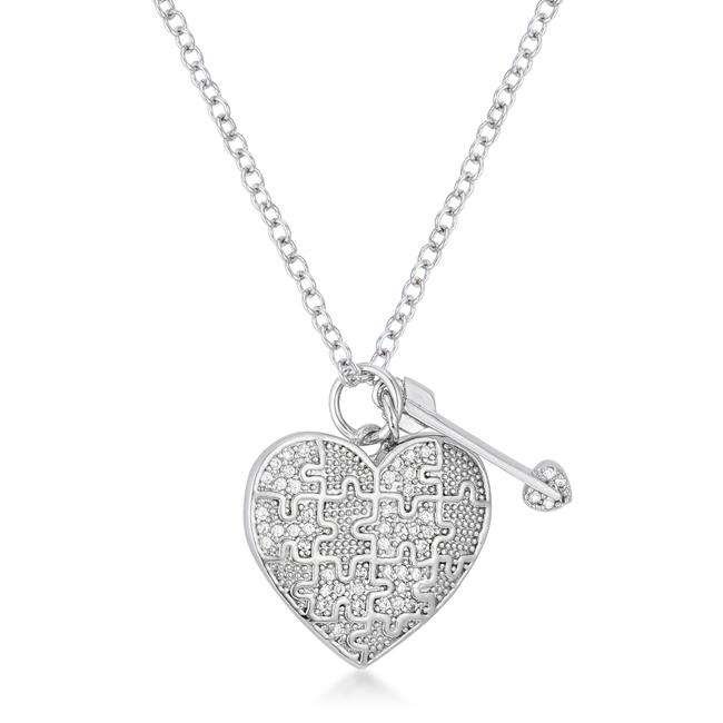 This lovely necklace is rhodium plated and thats the metal that gives white gold its shine. Thats not the only reason this beauty shines though. The playful design places an arrow charm next to the heart and the heart has a jigsaw puzzle design! Cubic zirconia adds sparkle and not only are you sure to be noticed but someone is going to want to unlock the puzzle of your heart when they see you wearing this.