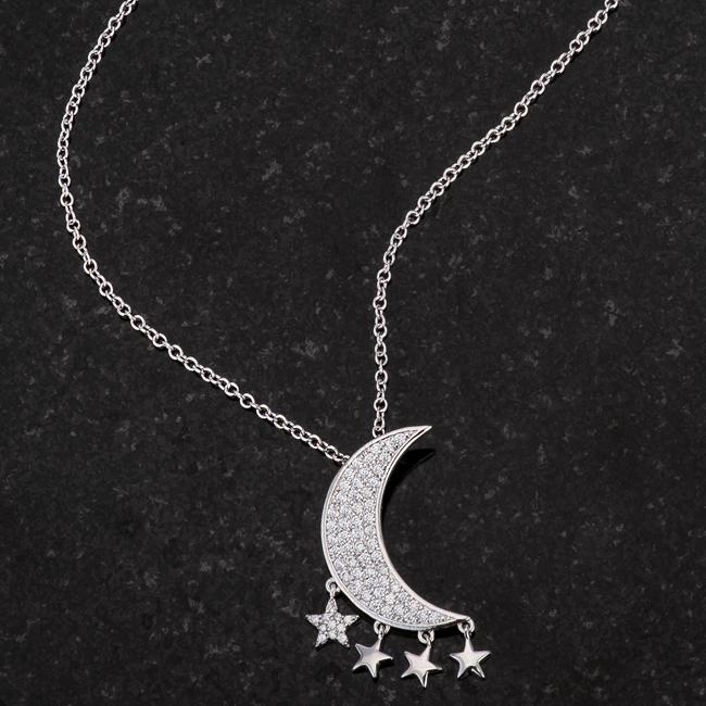 This necklace certainly has a night time theme but dont think youll get any sleep! The rhodium plating makes this piece shine and since this is the same metal that gives white gold its luster thats no surprise. The moon sparkles with clear cubic zirconia as does one of the four lovely stars that hang from the sky as they might in a beautiful cloudless night.