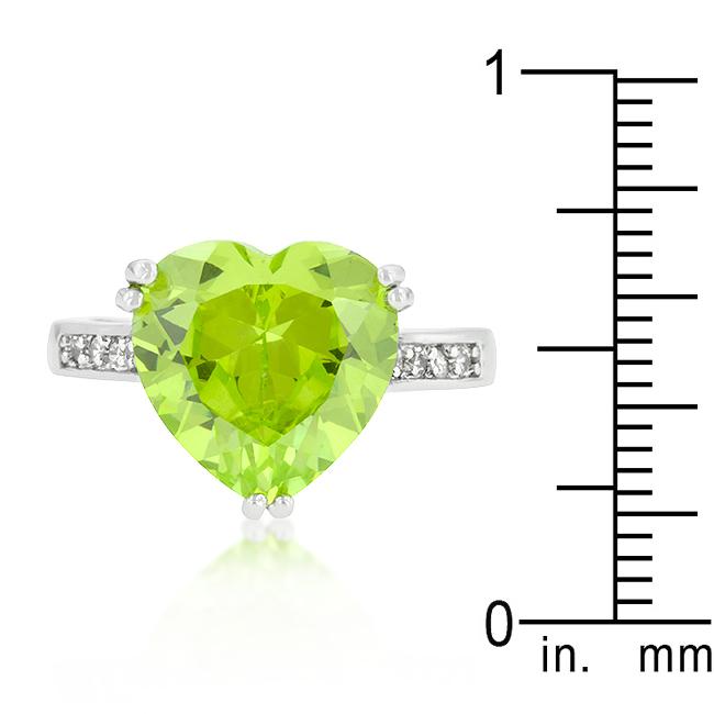 This attractive ring showcases an apple green heart hoisted on a classic ring shank. Our genuine rhodium finish is achieved using an electroplating process that coats the item with heavy layers of rhodium a close cousin to platinum which gives our jewelry a platinum luster.