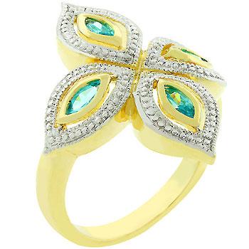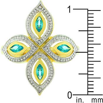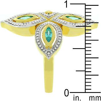Aqua Luxe is two toned in gold and rhodium with a marquise clover shape. The leaves are inlaid with aqua crystals and trimmed with milgrain rhodium accent. The main body of the ring is gold tone and designed with a contemporary philosophy. Our two-tone and tri-tone process use 18k gold that electroplated coating the item with heavy layers of 18k yellow gold giving it that 14k hamiliton gold polished look. The silver tone is achieved by applying a heavy coating of genuine rhodium to the item giving is a lustrous silver tone high polish.