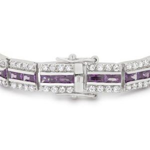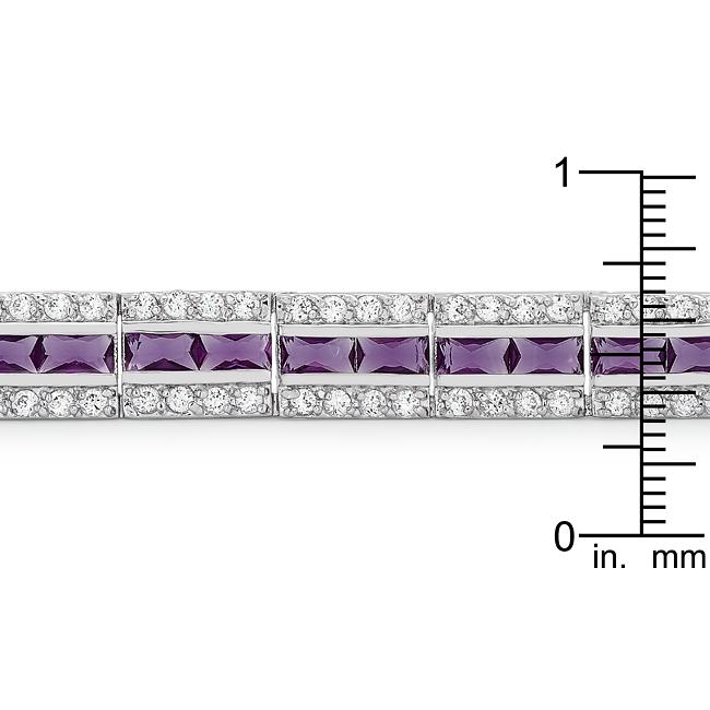 Fashioned in luminescent silver tone and three rows of assorted shimmer our Balboa Purple Cubic Zirconia Bracelet lends sassy tones to classic refinement. Our genuine rhodium finish is achieved using an electroplating process that coats the item with heavy layers of rhodium a close cousin to platinum which gives our jewelry a platinum luster.