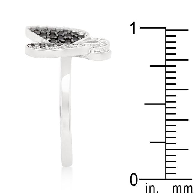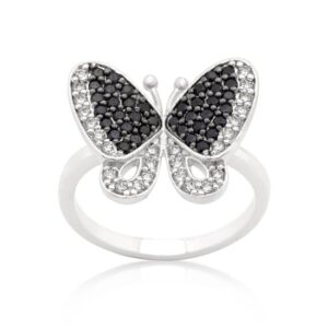 This statement ring features a cubic zirconia encrusted butterfly with black and white accents. Our two-tone and tri-tone process use 18k gold that electroplated coating the item with heavy layers of 18k yellow gold giving it that 14k hamiliton gold polished look. The silver tone is achieved by applying a heavy coating of genuine rhodium to the item giving is a lustrous silver tone high polish.