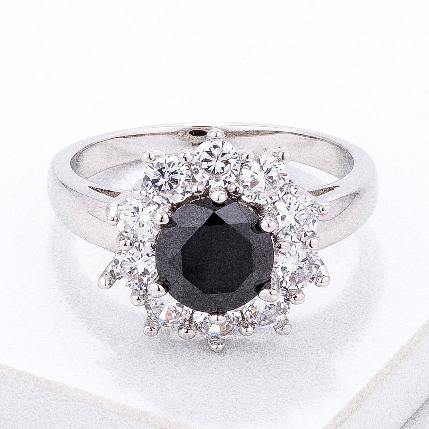 This 1.68 carat cocktail ring features a jet black center stone set within a sparkling halo of clear cubic zirconia. Its classic design makes it a versatile piece for day or night.
