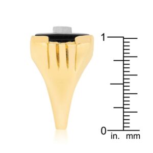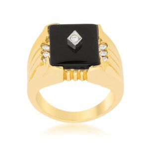 The Black Onyx Men’s Ring displays onyx and crystal over a golden shine. 18k plated gold is achieved using an electroplating process that coats the item with heavy layers of 18k Yellow Gold and color-treated to display a perfect 14k Hamilton gold color.
