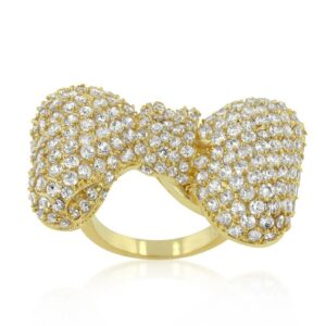 This sparkling pave cubic zirconia ring resembles a classy golden bow tie. 18k plated gold is achieved using an electroplating process that coats the item with heavy layers of 18k Yellow Gold and color-treated to display a perfect 14k Hamilton gold color.