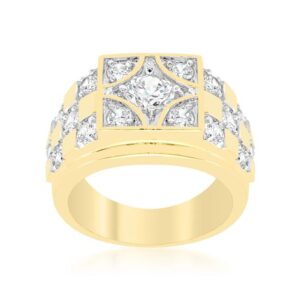 The Checkerboard Cubic Zirconia Ring is set with round but cubic zirconia and lustrous golden shine. Our two-tone and tri-tone process use 18k gold that electroplated coating the item with heavy layers of 18k yellow gold giving it that 14k hamiliton gold polished look. The silver tone is achieved by applying a heavy coating of genuine rhodium to the item giving is a lustrous silver tone high polish.