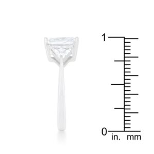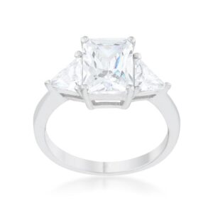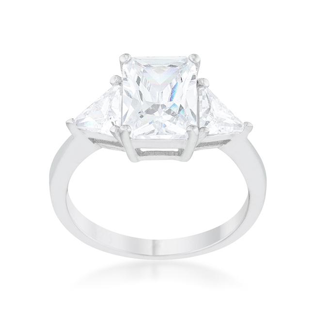 A pair of clear trillion cut stones accompany a sapphire emerald cut center stone in this elegant 4.5 carat engagement ring. A modern twist on a classic piece. Our genuine rhodium finish is achieved using an electroplating process that coats the item with heavy layers of rhodium a close cousin to platinum. This gives our jewelry a platinum luster.