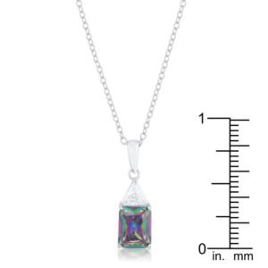 A single clear trillion cut stone accompanies a mystic radiant cut center stone in these elegant 4ct CZ simple drop necklace. A contemporary twist on a simple drop necklace. Our genuine rhodium finish is achieved using an electroplating process that coats the item with heavy layers of rhodium a close cousin to platinum. This gives our jewelry a platinum luster.