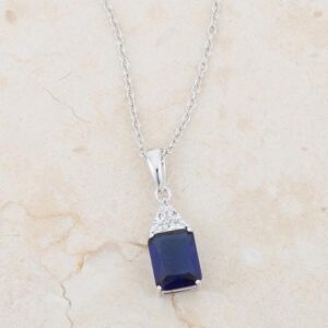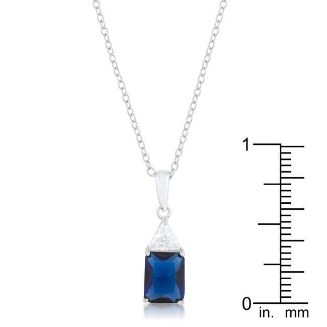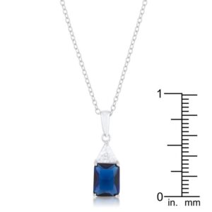 A single clear trillion cut stone accompanies a sapphire radiant cut center stone in these elegant 4ct CZ simple drop necklace. A contemporary twist on a simple drop necklace. Our genuine rhodium finish is achieved using an electroplating process that coats the item with heavy layers of rhodium a close cousin to platinum. This gives our jewelry a platinum luster.