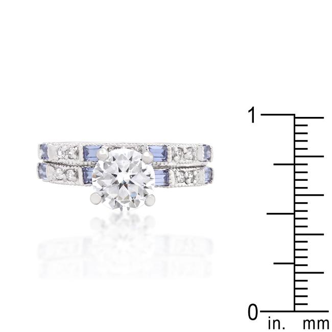 Tanzanite color cubic zirconia stones intermingle with an array of sparkling clears to create a ring set that’s delicately enticing. Our genuine rhodium finish is achieved using an electroplating process that coats the item with heavy layers of rhodium a close cousin to platinum which gives our jewelry a platinum luster.