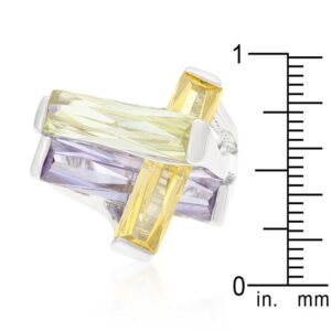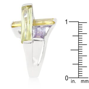 The Crystalline Sculpture is a 3-stone ring featuring radiant cut jonquil lavender and peridot cubic zirconia hoisted over a silver tone shank. Our genuine rhodium finish is achieved using an electroplating process that coats the item with heavy layers of rhodium a close cousin to platinum which gives our jewelry a platinum luster.