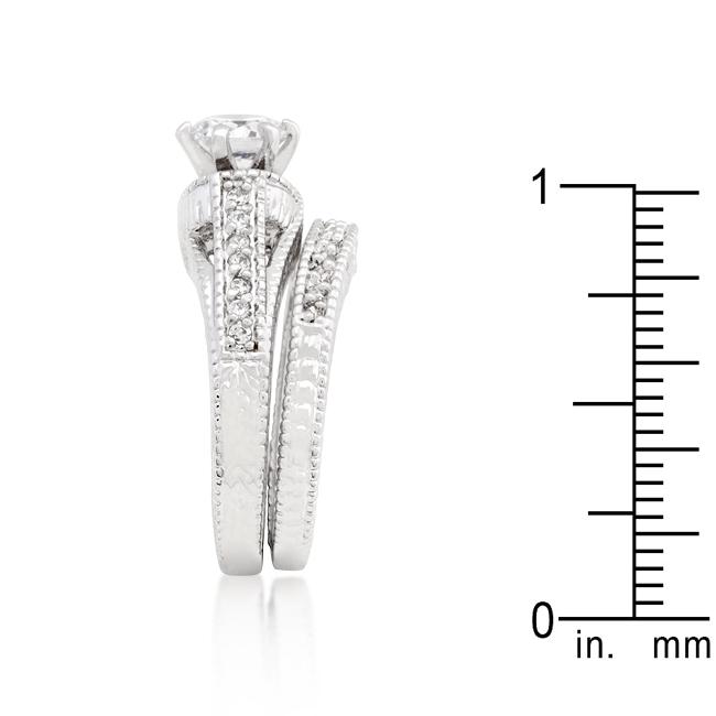 Fashioned in an art deco design this engagement ring set is storybook perfect for that literary girl. Our genuine rhodium finish is achieved using an electroplating process that coats the item with heavy layers of rhodium a close cousin to platinum which gives our jewelry a platinum luster.