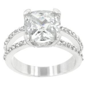 This ring is sure to grab attention from it’s beauty and shine. The unique five carat cushion cut clear cubic zirconia sits above a double band of round clear cubic zirconia in brilliant silver tone shine. Genuine Rhodium Plating is achieved using an electroplating process that coats the item with heavy layers of rhodium a close cousin to platinum which gives our jewelry a platinum luster.