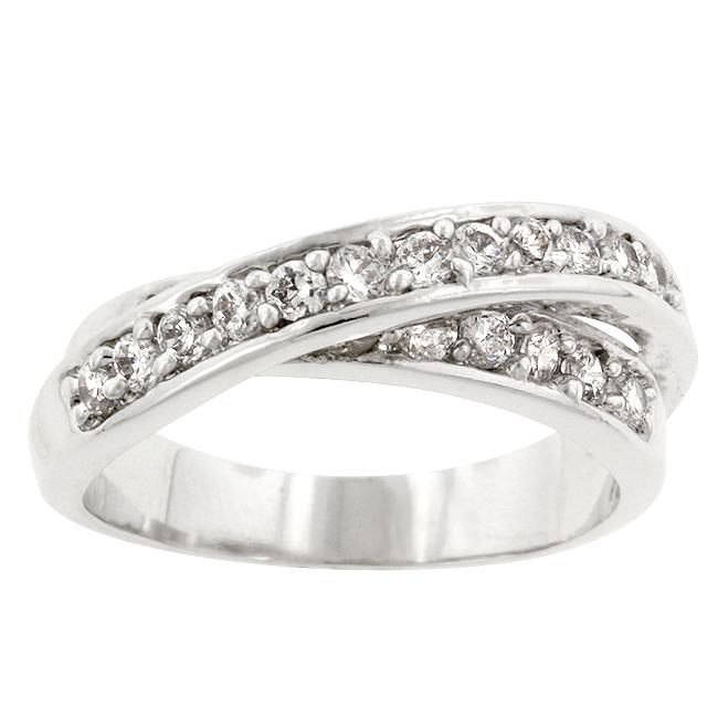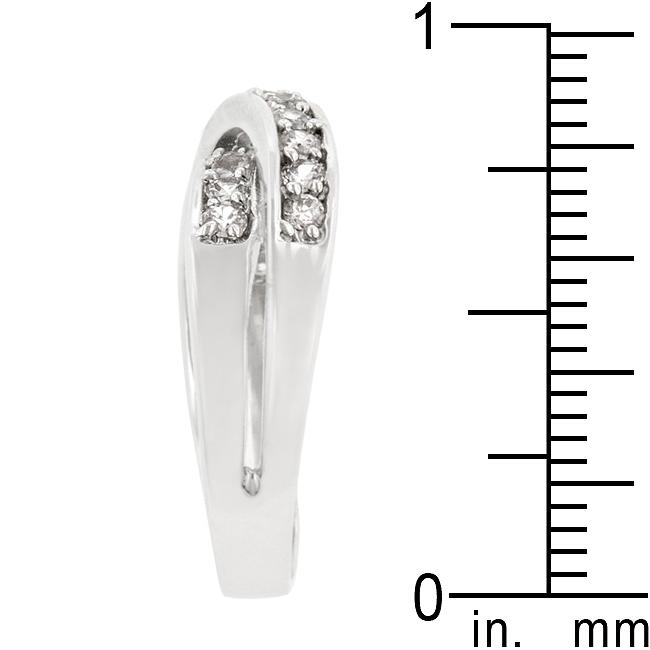 This silver tone delight is adorned with two bands of prong set cubic zirconia conjoined at the base. Looking down on it gives the illusion of two separate eternity bands. Genuine Rhodium Plating is achieved using an electroplating process that coats the item with heavy layers of rhodium a close cousin to platinum which gives our jewelry a platinum luster.