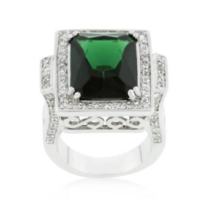 This green cubic zirconia cocktail ring has shiny silver tone polish and filigree craftsmanship. Our genuine rhodium finish is achieved using an electroplating process that coats the item with heavy layers of rhodium a close cousin to platinum which gives our jewelry a platinum luster.