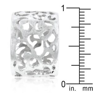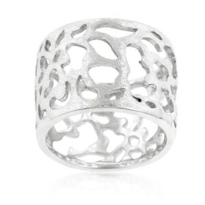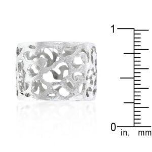 Simple and stylish our Filigree Matte Rhodium Ring features a wide 16 mm band that is stamped and textured to present that interesting and unique look every woman is after. Our genuine rhodium finish is achieved using an electroplating process that coats the item with heavy layers of rhodium a close cousin to platinum which gives our jewelry a platinum luster.