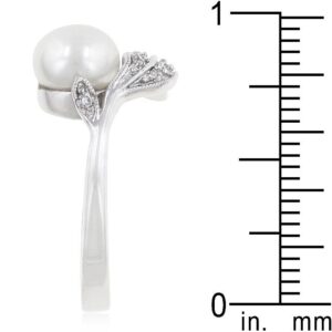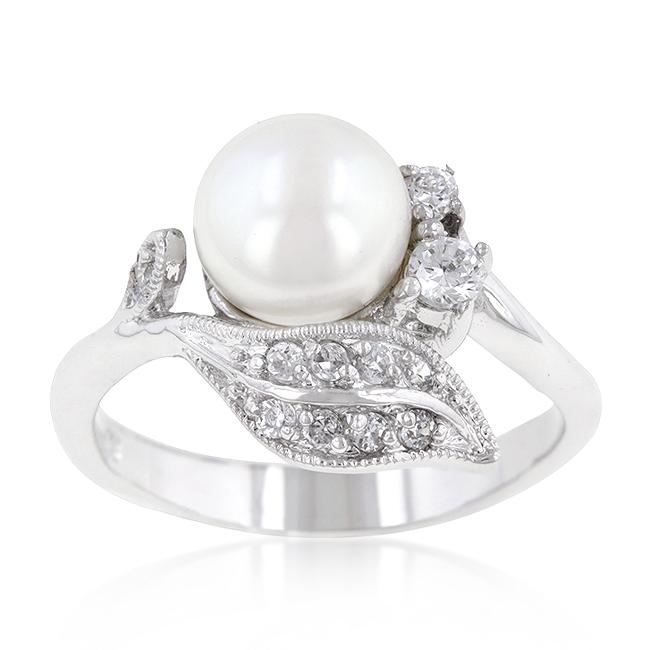 Fleur is a beautiful floral motif ring with a shell pearl centerpiece and a silver tone leaf accented with cubic zirconia. Genuine Rhodium Plating is achieved using an electroplating process that coats the item with heavy layers of rhodium a close cousin to platinum which gives our jewelry a platinum luster.