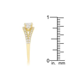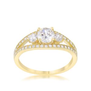Clear stones accent the setting of a modern trio ring for a delicately classic look.