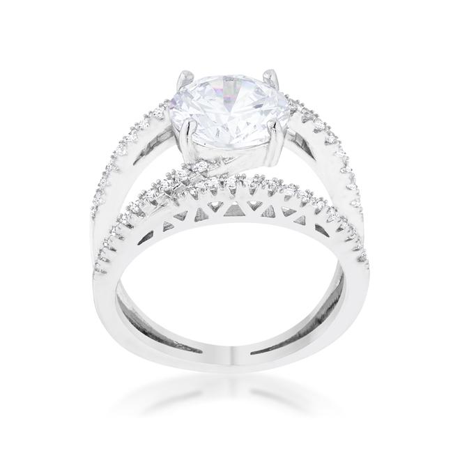 Clear stones line the setting of a contemporary ring while a solitary stone sits in between two bands.