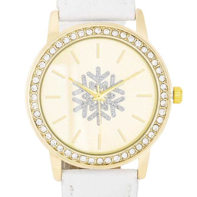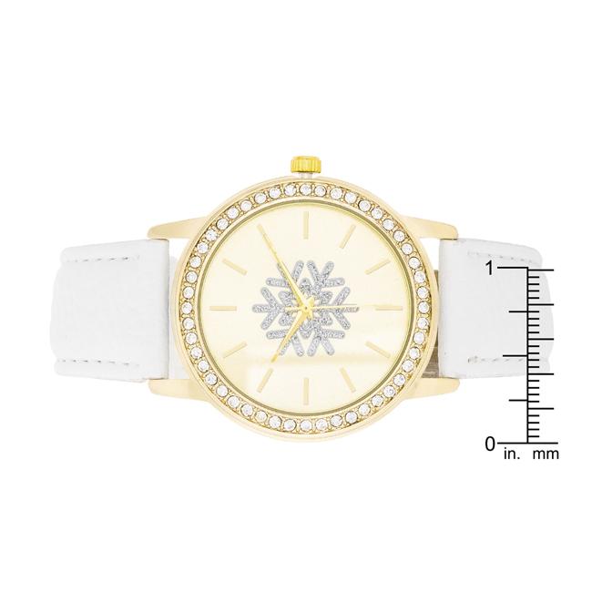 Gold Snowflake Crystal Watch With White Leather Strap