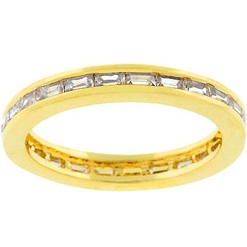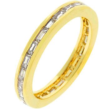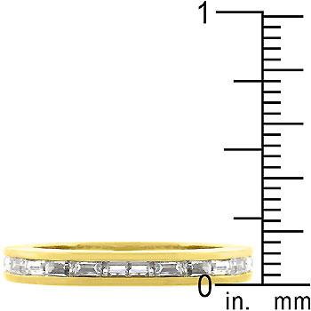 This stackable ring can be left by itself to complement another ring or worn as a pendent on a chain. The Golden White Eternity Ring features radiant clear cubic zirconia baguettes set in a gold tone that will pop under any light. 18k plated gold is achieved using an electroplating process that coats the item with heavy layers of 18k Yellow Gold and color-treated to display a perfect 14k Hamilton gold color.
