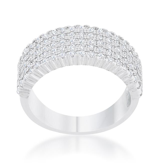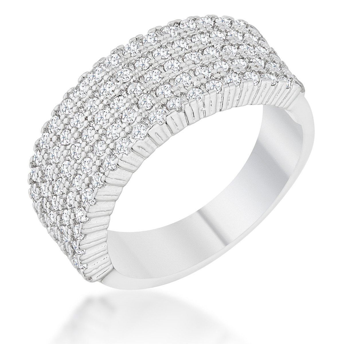 Clear stones accent the setting of a classic wide cocktail ring. So elegantly understated its simple design lends a classic appeal. Our genuine rhodium finish is achieved using an electroplating process that coats the item with heavy layers of rhodium a close cousin to platinum. This gives our jewelry a platinum luster.