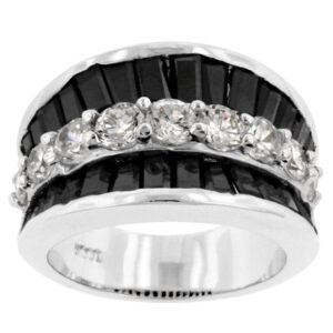 Itza features two rows of jet black cubic zirconia baguettes that border a row of clear cubic zirconia all set in a lustrous silver tone. Genuine Rhodium Plating is achieved using an electroplating process that coats the item with heavy layers of rhodium a close cousin to platinum which gives our jewelry a platinum luster.