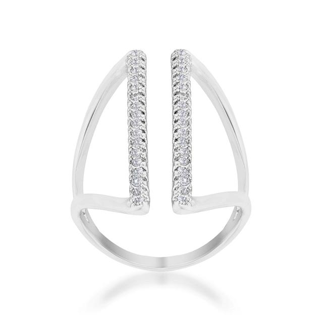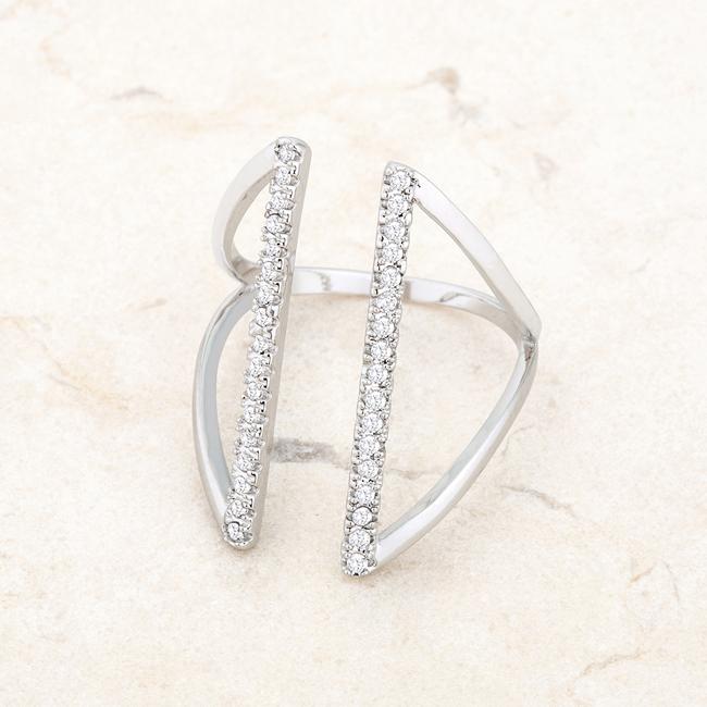 Clear stones accent the design of a contemporary open ring. Delicate and subtle yet makes a trendy statement. Our genuine rhodium finish is achieved using an electroplating process that coats the item with heavy layers of rhodium a close cousin to platinum. This gives our jewelry a platinum luster.