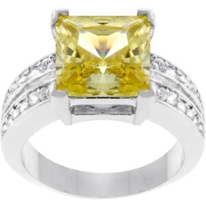 This yellow cubic zirconia ring is gorgeous. The stone pops with the AAA cubic zirconia princess cut canary colored stone. The pave shoulders are classic and elegant. Genuine Rhodium Plating is achieved using an electroplating process that coats the item with heavy layers of rhodium a close cousin to platinum which gives our jewelry a platinum luster.