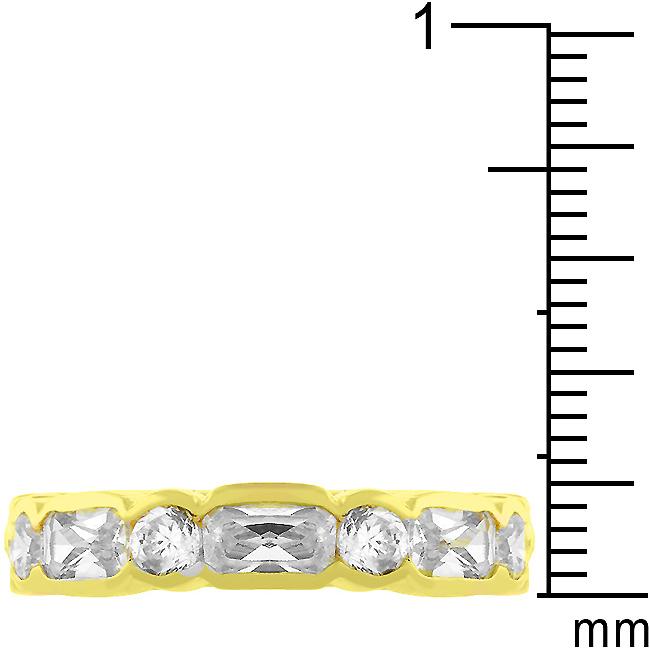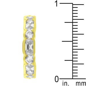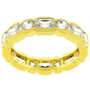 The Juliette Ring features radiant and round cut clear cubic zirconia in a shiny gold tone. This eternity style ring is classy yet comfortable. 18k plated gold is achieved using an electroplating process that coats the item with heavy layers of 18k Yellow Gold and color-treated to display a perfect 14k Hamilton gold color.