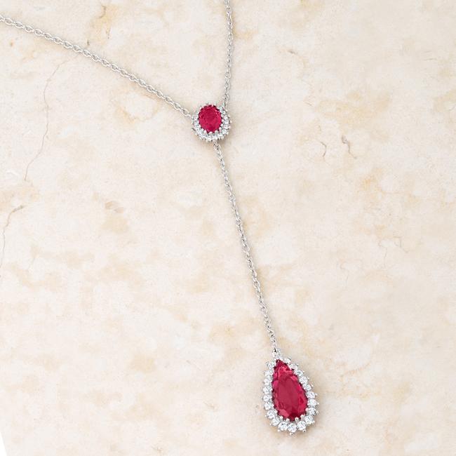 Clear stones lightly surround large teardrop shape ruby stones in this glamorous lariat drop necklace. So elegantly simple– perfect for cocktail wear! Our genuine rhodium finish is achieved using an electroplating process that coats the item with heavy layers of rhodium a close cousin to platinum. This gives our jewelry a platinum luster.