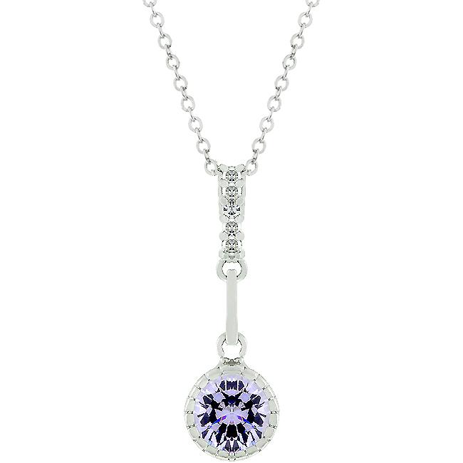 Lavender Hanging Bliss is a sparkling round lavender cubic zirconia hanging on a blissful line of smaller clear cubic zirconia in a perfect silver tone. Peaceful subtle and stunningly beautiful. Genuine Rhodium Plating is achieved using an electroplating process that coats the item with heavy layers of rhodium a close cousin to platinum which gives our jewelry a platinum luster.