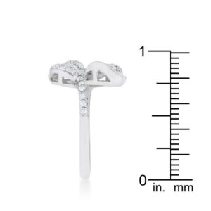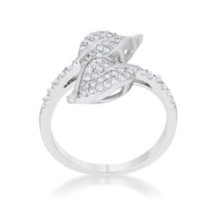 Clear stones accent a leaf design in this charming wrap ring. Subtle yet feminine– a perfect combination. Our genuine rhodium finish is achieved using an electroplating process that coats the item with heavy layers of rhodium a close cousin to platinum. This gives our jewelry a platinum luster.