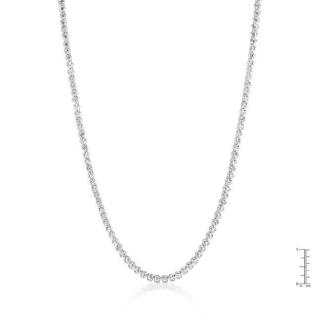 Gorgeous round cut stones are placed side by side to create a long elegant necklace beautiful for glamorous occasions. Our genuine rhodium finish is achieved using an electroplating process that coats the item with heavy layers of rhodium a close cousin to platinum which gives our jewelry a platinum luster.