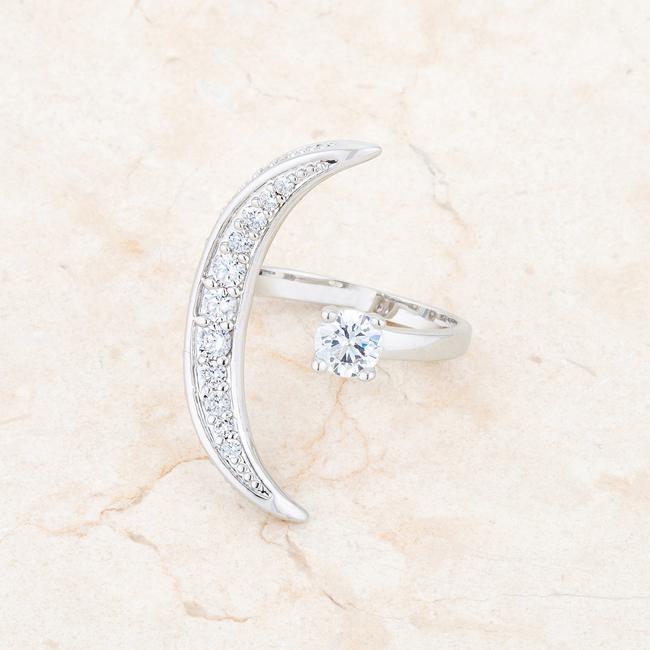 Clear stones accent a moon design in this delicate wrap ring. Delicate and subtle yet makes a trendy statement. Our genuine rhodium finish is achieved using an electroplating process that coats the item with heavy layers of rhodium a close cousin to platinum. This gives our jewelry a platinum luster.