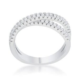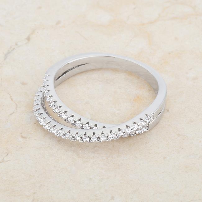 Clear stones accent the setting of a classic intertwined double design in this on-trend simple ring. It is topped off with delicate elements that make this beautifully elegant! Our genuine rhodium finish is achieved using an electroplating process that coats the item with heavy layers of rhodium a close cousin to platinum. This gives our jewelry a platinum luster.