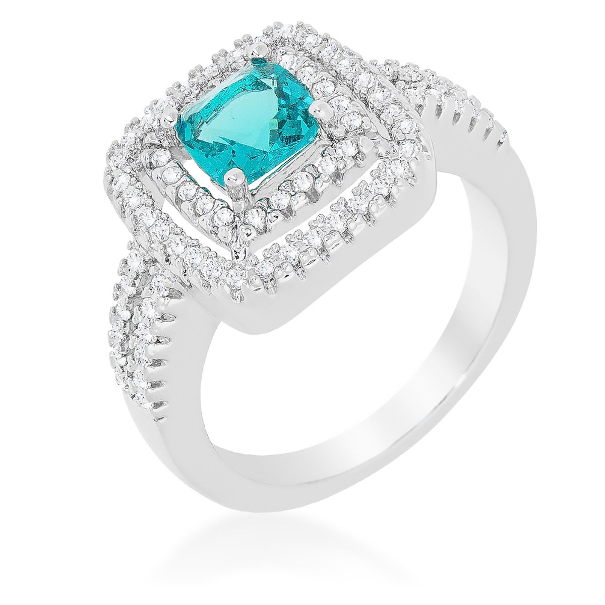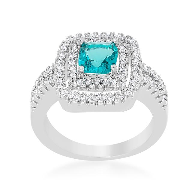 Crafted from rhodium and embellished with fine cut cubic zirconia this ring features aqua and white cubic zirconia that will sparkle on your finger anywhere. Our genuine rhodium finish is achieved using an electroplating process that coats the item with heavy layers of rhodium a close cousin to platinum which gives our jewelry a platinum luster.