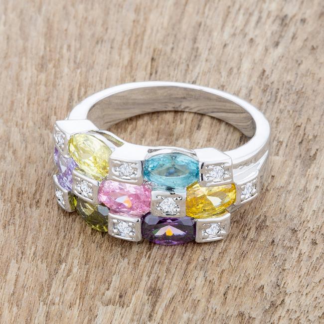 A mix of multicolor stones in varying stone cuts accent a classic stacked design of this elegant statement piece.
