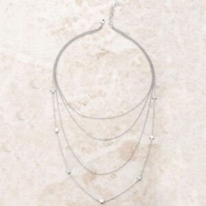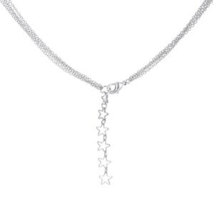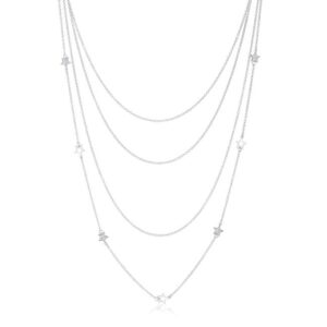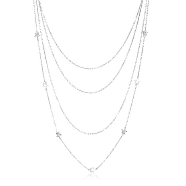 This lovely necklace features four elegant rhodium-plated chains. Rhodium famed as the metal that gives white gold its shine forms a lovely basis for the stars on the outermost chain and round cubic zirconia adds sparkle. The overall effect is a lovely necklace that is sure to draw comments and more.