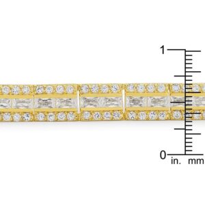 Fashioned in lustrous gold tone and three rows of assorted shimmer our Newport Cubic Zirconia Bracelet lends sassy tones to classic refinement. 18k plated gold is achieved using an electroplating process that coats the item with heavy layers of 18k Yellow Gold and color-treated to display a perfect 14k Hamilton gold color.