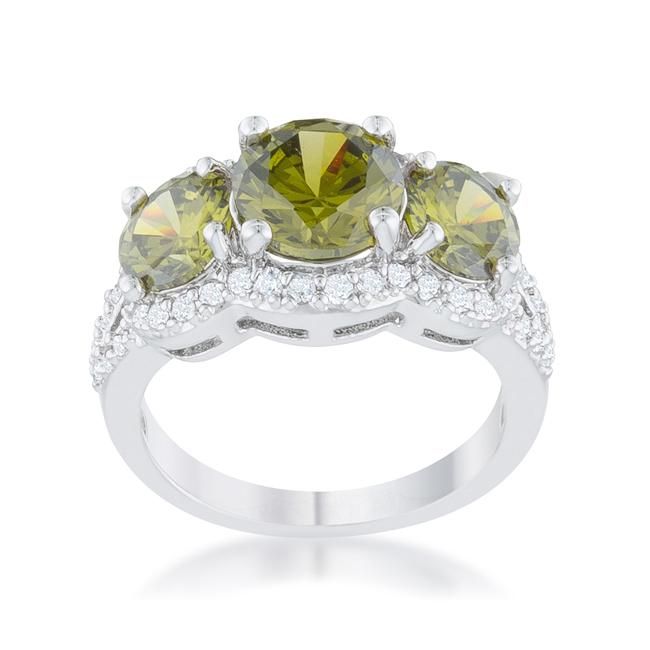 Clear finely cut stones accent a trio of elegant green olive stones in this classic 6.75 carat cocktail ring. Our genuine rhodium finish is achieved using an electroplating process that coats the item with heavy layers of rhodium a close cousin to platinum. This gives our jewelry a platinum luster.
