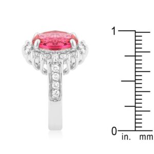This beautiful ring features an oval shaped ruby red color crystal mounted on a crown of pave white cubic zirconia. Our genuine rhodium finish is achieved using an electroplating process that coats the item with heavy layers of rhodium a close cousin to platinum which gives our jewelry a platinum luster.