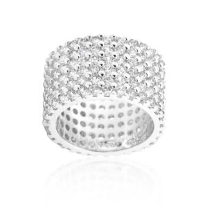 This glamorous Wide Pave cubic zirconia Ring features beautiful rows of sparkling stones in a wide rim design. Our genuine rhodium finish is achieved using an electroplating process that coats the item with heavy layers of rhodium a close cousin to platinum which gives our jewelry a platinum luster.
