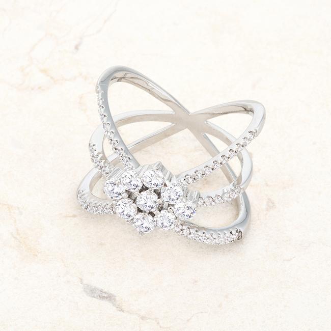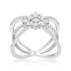 Clear stones accent the silhouette of a delicate geometric-style ring. The perfect mix of class and edge. Our genuine rhodium finish is achieved using an electroplating process that coats the item with heavy layers of rhodium a close cousin to platinum. This gives our jewelry a platinum luster.