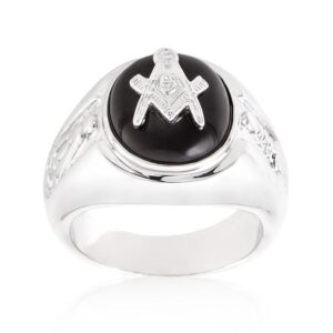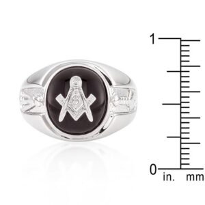 This onyx ring features a Masonic emblem and a shimmering silver tone. Genuine Rhodium Plating is achieved using an electroplating process that coats the item with heavy layers of rhodium a close cousin to platinum which gives our jewelry a platinum luster.