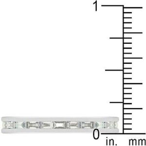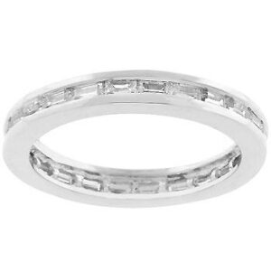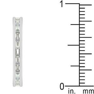 This stackable ring can be left by itself to complement another ring or worn as a pendent on a chain. The rhodium plated White Eternity Ring features radiant clear cubic zirconia baguettes set in a silver tone that will pop under any light. Our genuine rhodium finish is achieved using an electroplating process that coats the item with heavy layers of rhodium a close cousin to platinum which gives our jewelry a platinum luster.