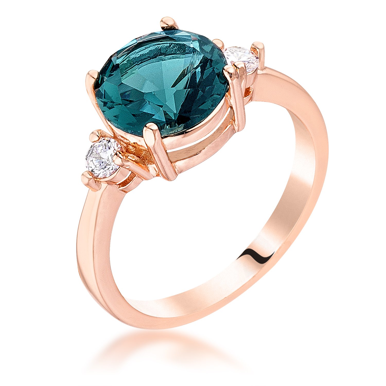 This ring features a mesmerizing beautiful peacock blue center stone and is highlighted with dazzling white cubic zirconia on either side. This elegant ring is polished in a rose gold finish for a brilliant shine and is the perfect elegant sophisticated piece to add to your collection.