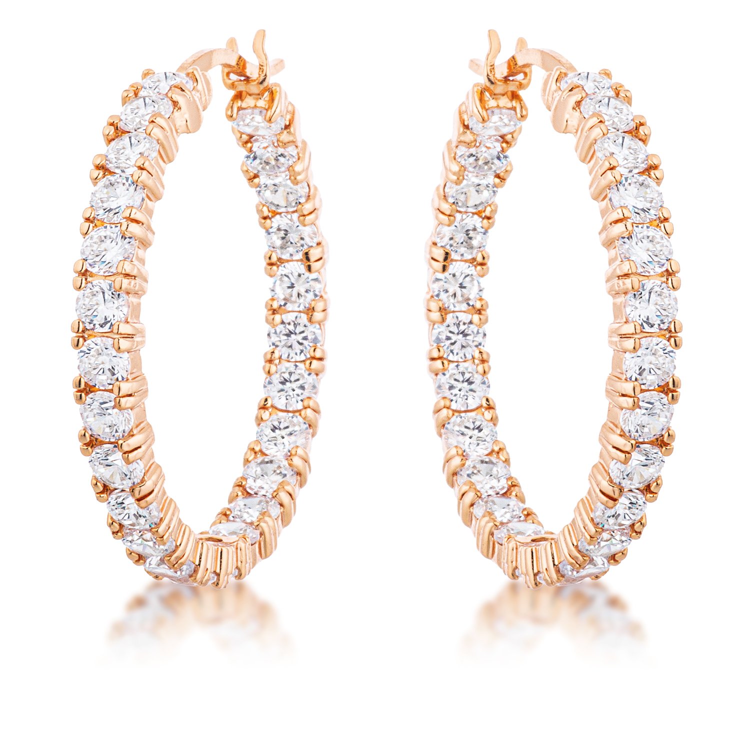 The possibilities are endless with these inside and outside channel set round cubic zirconia 18k rose gold plated eternity hoop earrings. They match almost anything subtle enough to wear everyday but beautiful enough to make you shine.